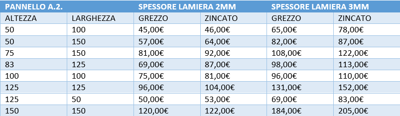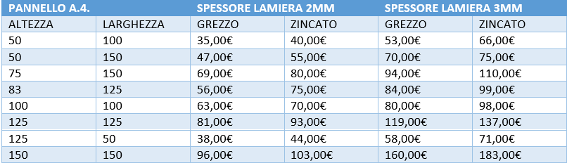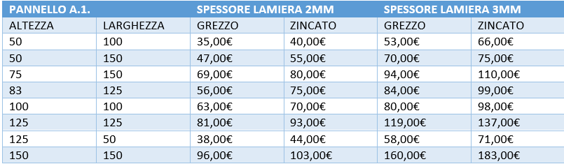 Produciamo pannelli in lamiera pantografata con diversi tipi di spessore e misure (nel catalogo sono presenti solo due tipi di spessore per altri spessori richiedere preventivo altrettanto per le misure ), possiamo fornirli grezzi oppure zincati anche verniciati a polvere su richiesta. Utilizziamo acciaio s275 che li rende maggiormente robusti nello stesso tempo leggeri ed economici . Inoltre se nel nostro catalogo non ci dovrebbe essere niente che vi possa soddisfare potete direttamente contattarci tramite i nostri recapiti per creare un modello tutto vostro !